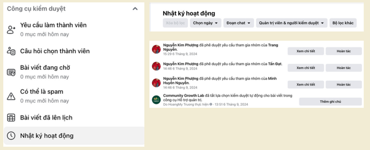 Tại đây QTV/người kiểm duyệt có thể tìm kiếm lại hoạt động cũ dựa trên bộ lọc (chọn ngày, QTV/người kiểm duyệt, thành viên, hành động kiểm duyệt, …)