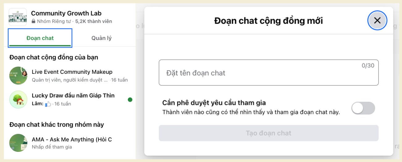 Trên cửa sổ “Đoạn chat cộng đồng mới", gõ tên đoạn chat và nhấn Tạo đoạn chat