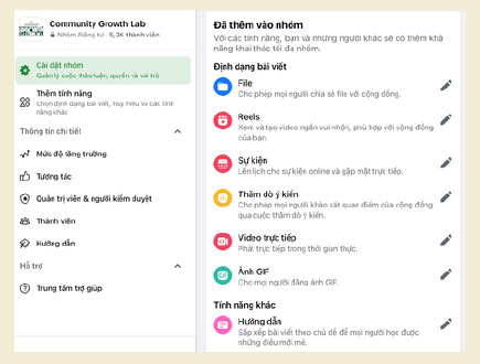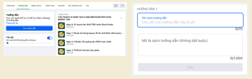Mục Hướng dẫn là nơi lưu trữ các tài liệu hướng dẫn, các thử thách quan trọng của cộng đồng. Dù không quá nhanh trôi tin bài như các messaging apps hay news feed facebook nhưng Facebook group vẫn thuộc dạng “bài mới đẩy trôi bài cũ". Cách quy hoạch các nội dung thử thách hoặc các hướng dẫn quan trọng vào tab Hướng dẫn sẽ giúp thành viên có trải nghiệm đọc mượt mà hơn.
