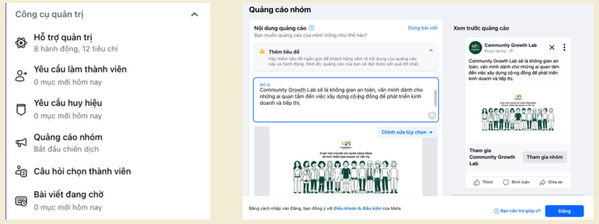 Nhấn vào Quảng cáo nhóm trên thanh menu góc trái trang facebook group.