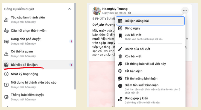 Có thể chọn: đổi lịch đăng bài, đăng ngay, chỉnh sửa bài viết, xoá bài viết