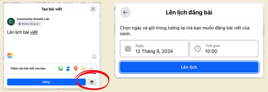 Chọn tính năng "lên lịch” (ở góc phải phía dưới cửa sổ đăng bài)