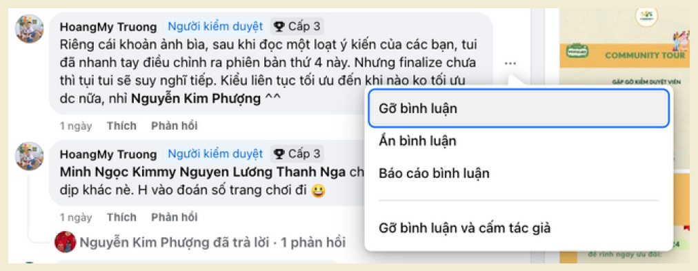 Chọn phương án phù hợp: Gỡ bình luận, Ẩn bình luận, Báo cáo bình luận, Gỡ bình luận và cấm tác giả.