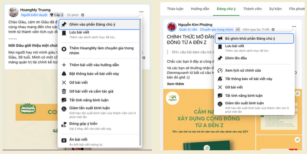 Khi muốn bỏ ghim một bài viết, QTV nhấn vào mục Đáng chú ý trên thanh menu, kéo đến bài viết cần gỡ, nhấn vào biểu tượng “…” bên góc phải bài đăng và nhấn “Bỏ ghim khỏi phần Đáng chú ý"