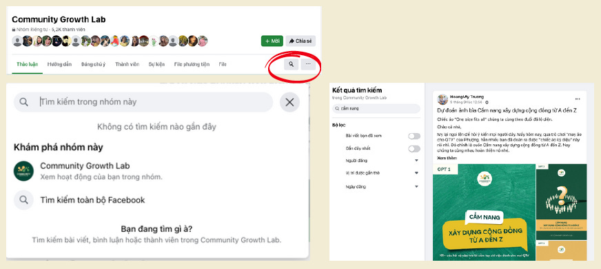 Sử dụng công cụ “search” trong cộng đồng. Bạn có thể tìm kiếm bài viết, bình luận hoặc thành viên trong cộng đồng.