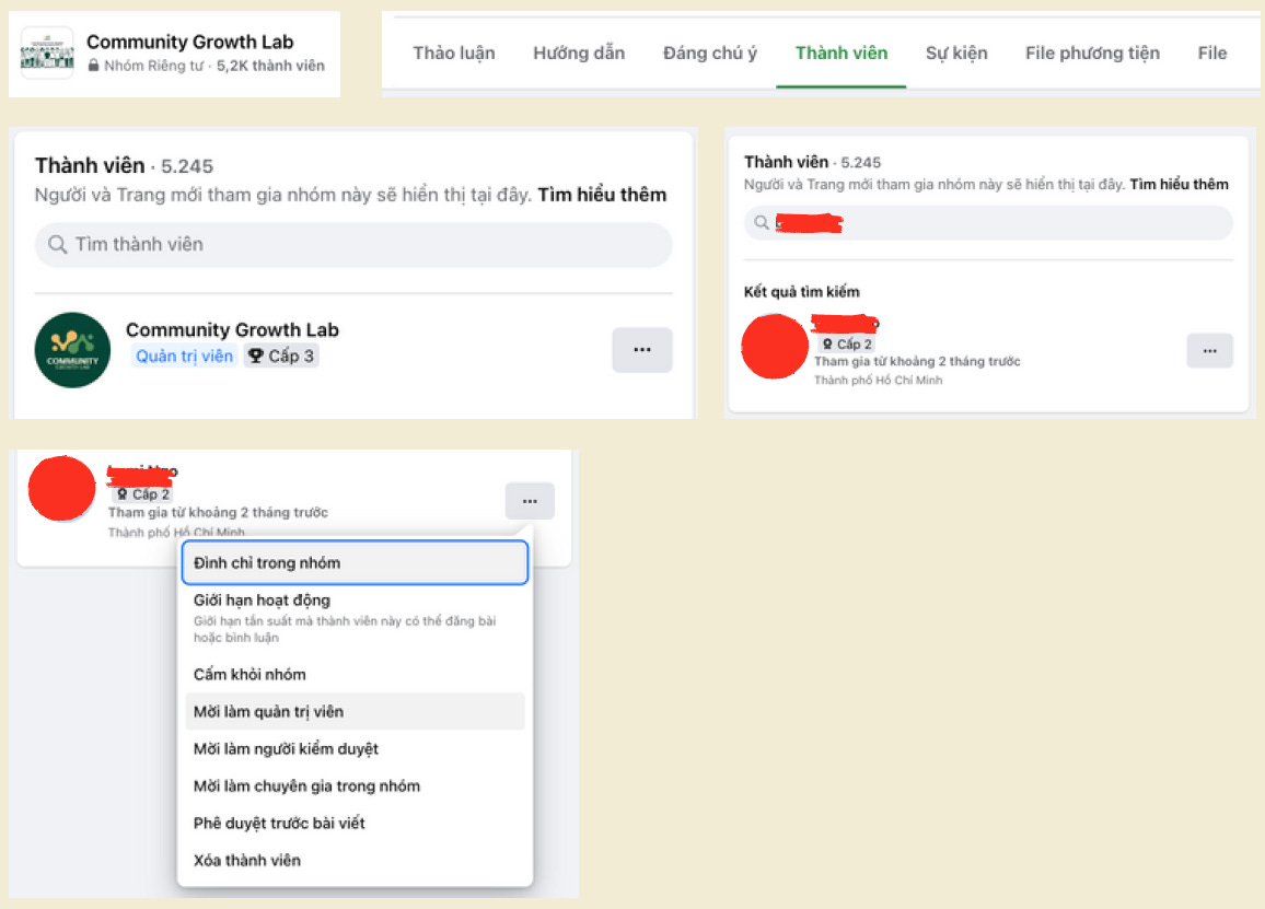 Giới hạn hoạt động: tạm thời giới hạn hoạt động đăng bài viết (số lượng bài viết thành viên có thể đăng trong một ngày) và bình luận của một thành viên (số lượng bình luận thành viên có thể đăng trong một giờ) trong nhóm.