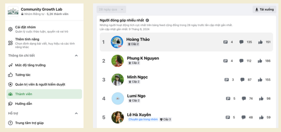 Nhấn Thành viên, QTV sẽ xem được danh sách 10 người đóng góp nhiều nhất trong 28 ngày qua (kèm số lượng bài viết, reactions và bình luận)